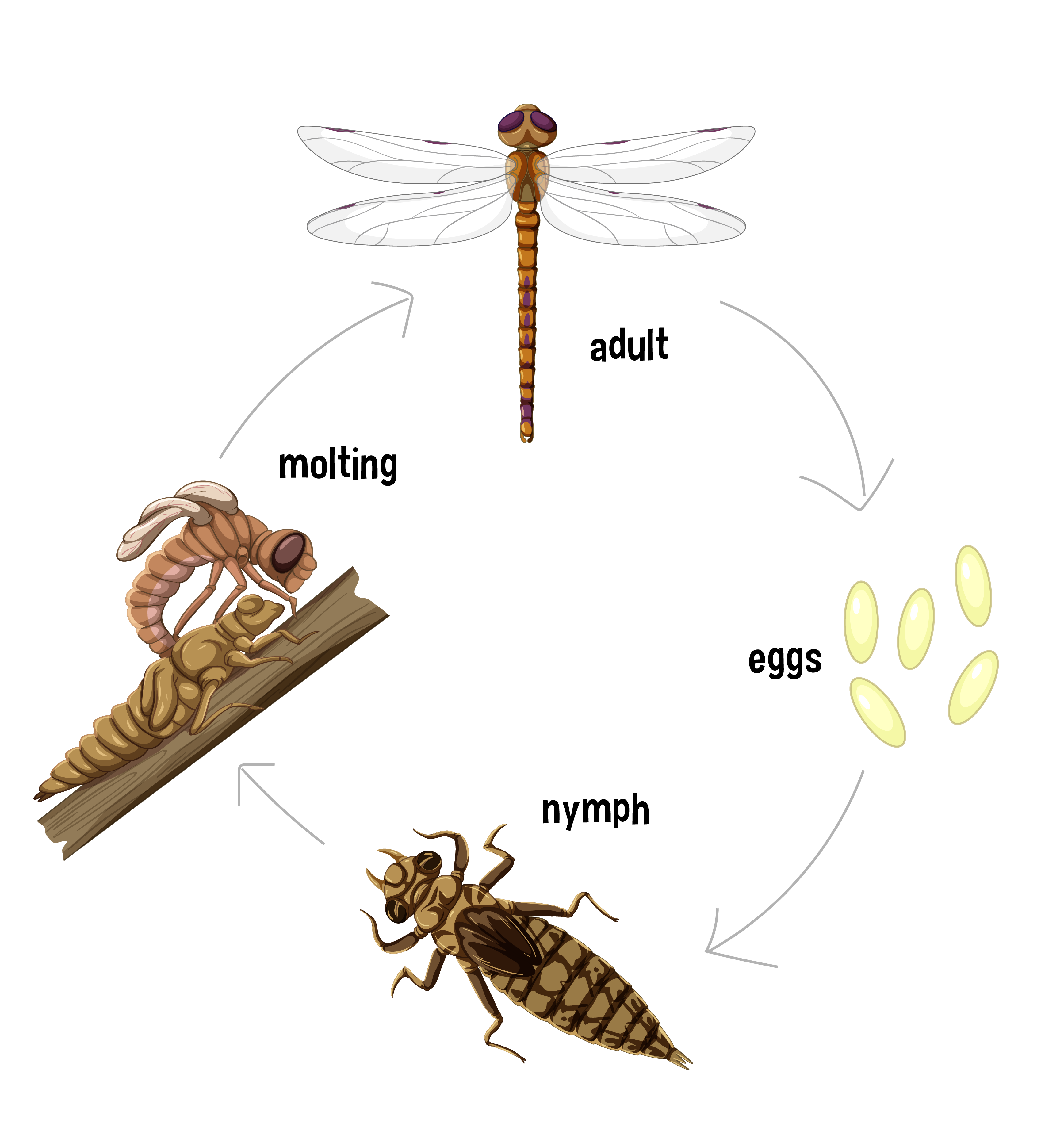 The dragonfly life cycle has three stages: the embryo, the larva (or nymph), and an adult. Dragonflies can live as aquatic larvae underwater for more than 2 years. Dragonflies belong to the insect order Odonata.