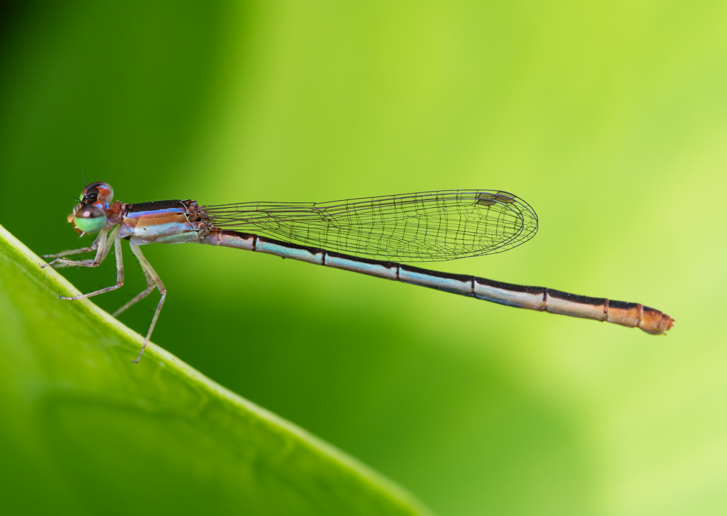 Damselflies, like dragonflies, are predators, feeding on small insects such as mosquitoes, flies, and gnats. They are often found near freshwater habitats such as ponds, lakes, streams, and rivers, where they lay their eggs and spend the majority of their lives in their nymphal aquatic stage before emerging as adults. Damselflies are valued for their role in controlling insect populations and are also appreciated for their beauty and intricate flying patterns.